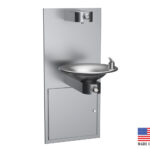 Standard Features: Vandal proof 14 gauge stainless steel bottle filler, mounted on 3/8″ steel mounting tongue above lower bowl; soft touch button with set screw for security; matching bottom plate secured with “snake eye” screws