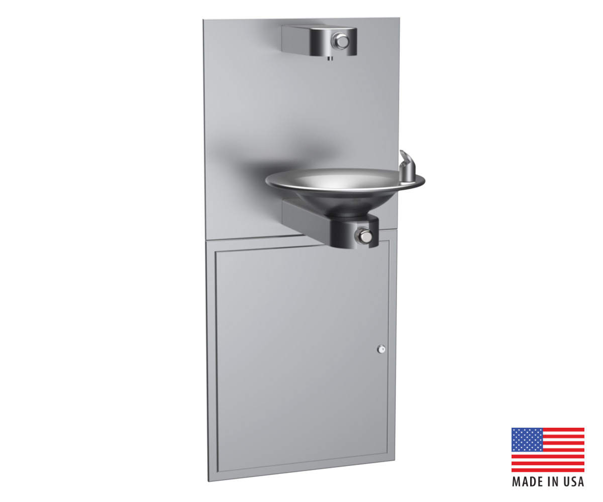 This vandal proof model combines our distinctive 107-14 fountain with a vandal proof bottle filler (along with other vandal proof features) and a no louver chiller/purifier in the cabinet below. Made in your choice of 16 gauge stainless steel or bronze, with 14 gauge support arms, the fountain bowl design features a 1/8" rolled edge and concealed seam. The chiller stores (2) gallons of chilled/purified water (serving a population of 100). The Taste Master® water purifier with 0.5 micron carbon block element removes lead, particles, tastes, odors and water-borne pathogens. Matching key-lock access door provides chiller/purifier access and security. Durable and beautiful, these fountains are available in a wide range of finishes and options including "Hands Free".