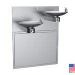 This model combines Filtrine's classic high/low 107-16 fountain and a chiller/purifier in the cabinet in the wall below. Made in your choice of 16 gauge stainless steel or bronze, with 14 gauge support arms, the fountain features seamless double bowls. The chiller stores (2) gallons of chilled/purified water (serving a population of 100). The Taste Master® water purifier with 0.5 micron carbon block element removes lead, particles, tastes, odors and water-borne pathogens. Matching key-lock door provides chiller/purifier access and security. Durable and beautiful, these fountains are available in a wide range of finishes and options including "Hands Free".